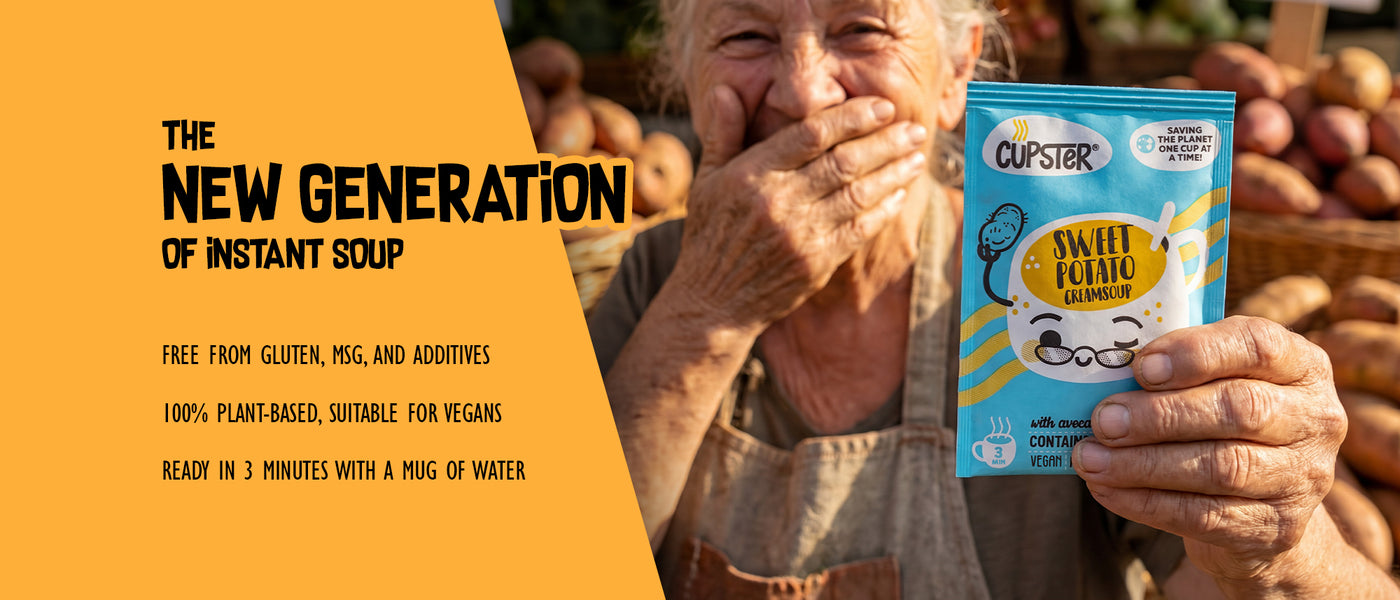 Cupster's instant vegan creamsoup made with gluten-free pasta and sweet potato to a velvety texture! This product comes in handy (in a hand-sized package!) when you need a fast meal, but don't want to give up your special diet or you are looking for a cleaner alternative. Try the new generation of instant soup!